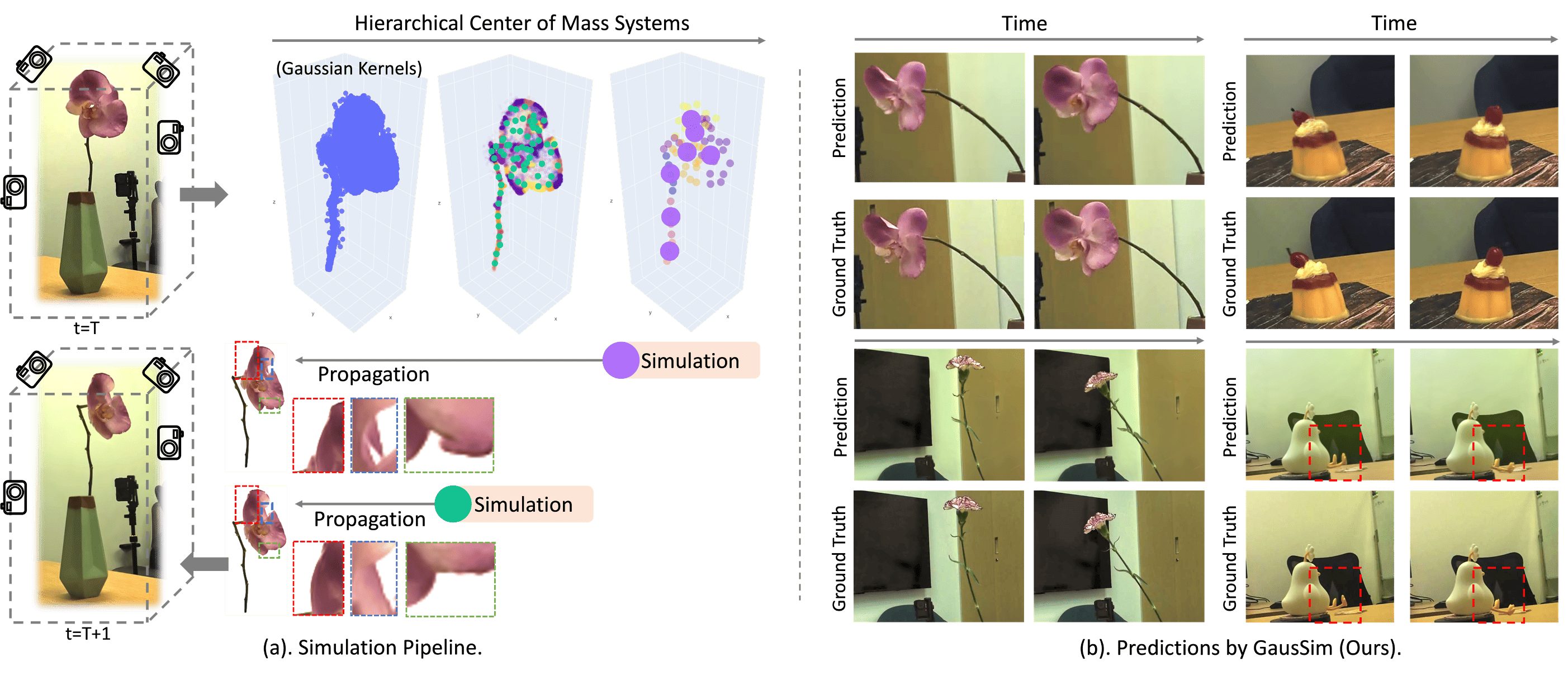 We introduce GausSim, a novel neural network-based simulator designed to capture the dynamic behaviors of real-world elastic objects represented through Gaussian kernels. We leverage continuum mechanics and treat each kernel as a Center of Mass System (CMS) that describes continuous piece of matter, accounting for realistic deformations without idealized assumptions. To improve computational efficiency and fidelity, we employ a hierarchical structure that further organizes kernels into CMSs with explicit formulations, enabling a coarse-to-fine simulation approach. This structure significantly reduces computational overhead while preserving detailed dynamics. In addition, GausSim incorporates explicit physics constraints, such as mass and momentum conservation, ensuring interpretable results and robust, physically plausible simulations. To validate our approach, we present a new dataset, READY, containing multi-view videos of real-world elastic deformations. Experimental results demonstrate that GausSim achieves superior performance compared to existing physics-driven baselines, offering a practical and accurate solution for simulating complex dynamic behaviors. Code and model are available at our project page